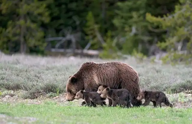 В дикой природе самки гризли не живут дольше 26 лет, но 24-летняя медведица Grizzly 399, которая обитает в Национальном парке Гранд-Титон, штат Вайоминг, только что произвела новый помет. Примечательно, что у нее родились четыре медвежонка, что само по себе крайне редко, так как у медведей в среднем бывает только два или три малыша. За всю свою долгую жизнь медведица родила 17 медвежат. Grizzly 399 является самой известной самкой бурого медведя в мире и даже имеет свои собственные учетные записи в Facebook, Instagram и Twitter.