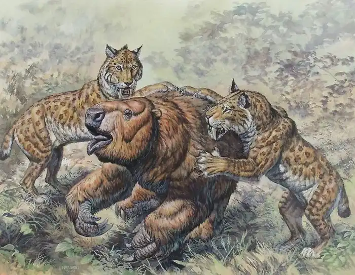 Но главным боссом в доисторической качалке был смилодон-разрушитель. Он набирал впечатляющие 400 кило. Пред котярой размером с медведя, вооружённой 20 сантиметровыми клыками-саблями, трепетала вся мегафауна Ледникового периода, даже мамонты!