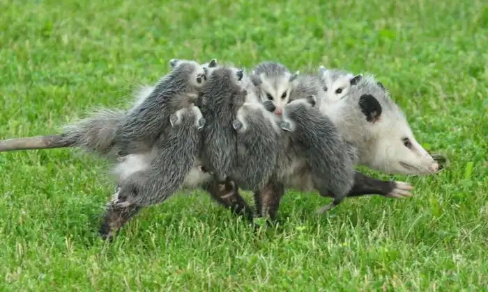 Во-вторых, самки опоссумов настоящие матери-героини. Через две недели после спаривания у «опоссумихи» рождается целый выводок детёнышей. Их число в некоторых случаях доходит до 25! Правда, они такие маленькие, что умещаются в ложке. Некоторое время малыши донашиваются в сумке матери. При выходе из сумки их редко остаётся больше 5 – 7. Подросшие детёныши мёртвой хваткой цепляются к шерсти самки и питаются материнским молоком.