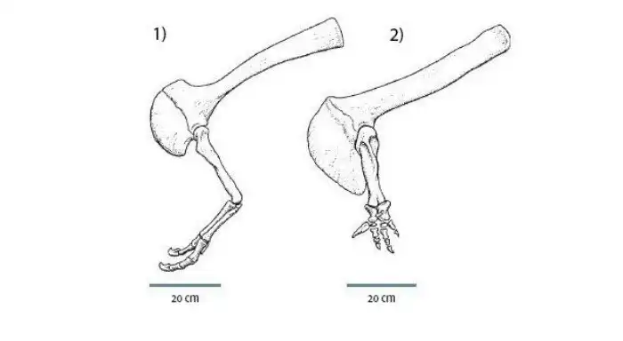 Чтобы вы понимали, насколько у карнотавра всё было плохо с лапками, вот вам сравнение с тираннозавром (1) — тираннозавр; 2) — карнотавр).
