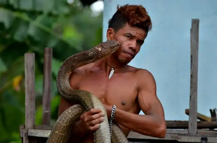 Даже такому величественному созданию человек умудрился испортить жизнь. Королевская кобра относится к уязвимым видам из-за нелегальной ловли рептилий и сокращения мест обитания.