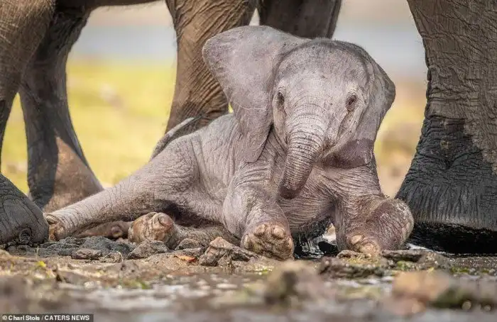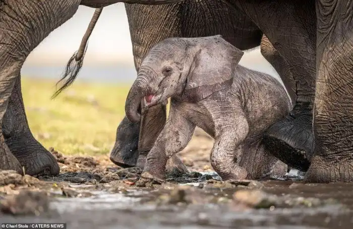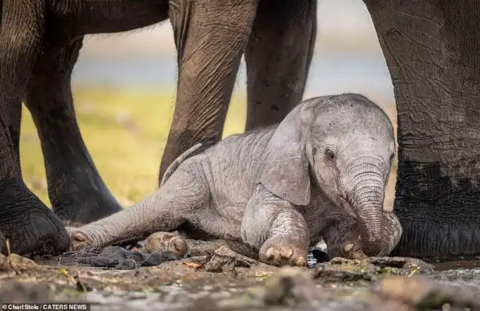 Ботсвана. Первая прогулка новорожденного слона. Он постоянно падал и поднимался с помощью мамы-слонихи.
