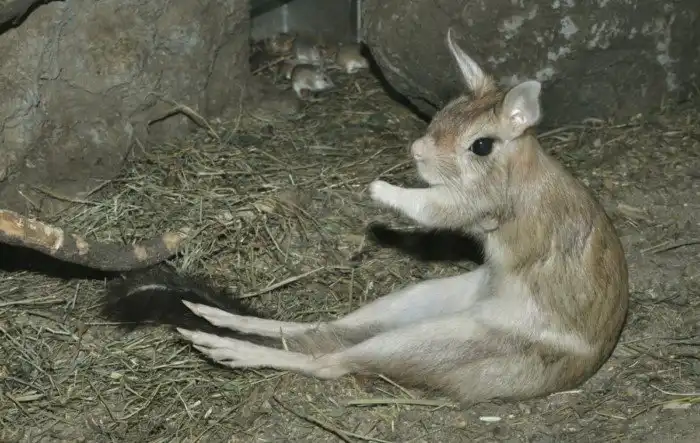 Нет, это не Пикачу, скорее плод страстной любви зайца, тушканчика и кенгуру. Непропорционально длинные задние ноги, такие же несоразмерно крохотные передние лапки и довольно большие уши (около 9 сантиметров) — всё это наталкивает на мысли о сомнительном тройничке. Но ни к первым, ни ко вторым, ни тем более к третьим наш герой отношения не имеет. Долгоног — представитель целого семейства имени себя любимого.
