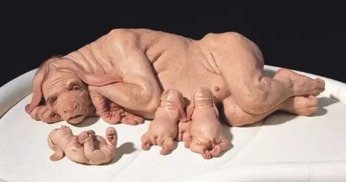 Скульптура Патриция Пиччинини, изображающая свиночеловека. Благо, что реальные люди со свиными органами выглядят не так!