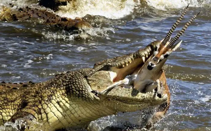 Фото отлично показывает насколько крокодил гигантский. Даже на фоне антилопы гну.