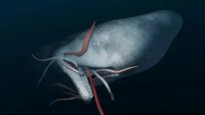 В битве титанов каждый применяет собственное секретное оружие: кашалот орёт на кальмара ультразвуком, дезориентируя и оглушая моллюска. Головоногий же намертво вцепляется в водоплавающую дубину присосками, не давая себя сожрать, а ей — всплыть.