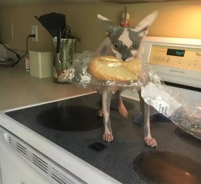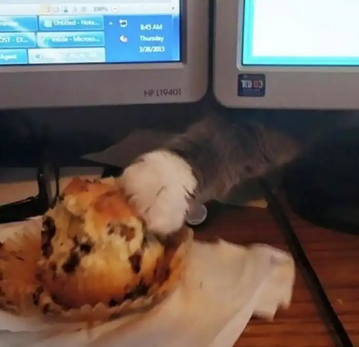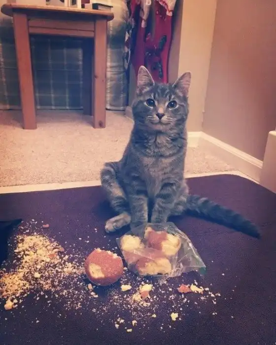 Коты - далеко не всеядные животные, часто буквально носом воротят, когда хозяева предлагают им разную еду. Но вот мимо еды самих хозяев они никогда не могут пройти мимо! Даже если не съесть, то просто стащить, свалить на пол или погрызть, а потом сделать невинный вид и просто горько пожалеть - но не о содеянном, а том, что их поймали с поличным: