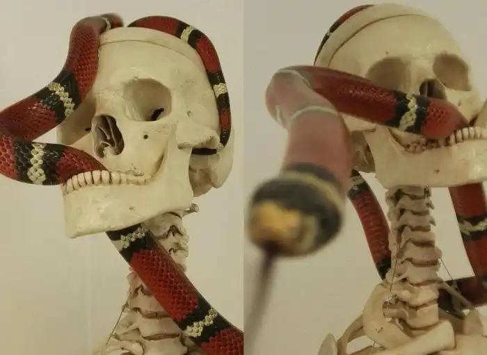 Знакомьтесь, королевская синалойская змея. Шнурок метром длиной замечателен тем, что он отлично врёт. Нет, впаривать что-то из серии «небитая, некрашеная, пробег 7000 км» он вам не станет, его обман куда изящнее. Своей красно-чёрно-жёлтой расцветкой и местом прописки в Средней Америке он копирует кораллового аспида! Для тех, кто не в теме: коралловый аспид — это змея, убийственность которой может сравниться с такими токсичными гигантами, как королевская кобра и чёрная мамба.
