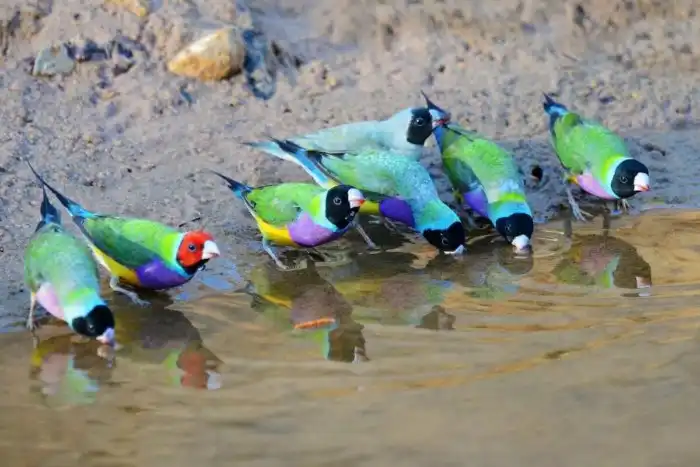 Пернатая зверюга обитает в Австралии, а точнее на ее севере, где товарищ Джон Гульд ее и нашел, шастая по саваннам. Птаха приспособилась к местному адовому пеклу. Даже в тени термометры выдают здесь запредельные + 45. Чтобы не откинуть лапки, амадины живут многотысячными стаями. А что? Удобно! Один воду увидел — и вот у лужи уже ютятся сотни разноцветных птиц.