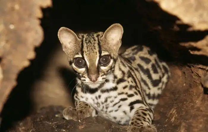 Большеглазая хищница высоко прыгает, ловко перемещается по деревьям, способна, подобно обезьяне, держаться задними лапками за ветку и висеть вниз головой. Но на этом не заканчиваются суперспособности этой кошки. Она умеет имитировать звуки обезьян. Хищница подражает крику детенышей тамаринов. Обманутые обезьяны сами идут в пушистые кошачьи лапы.