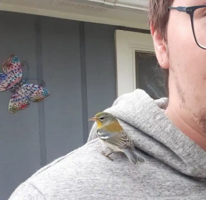«Я вышел на задний двор, чтобы выпустить собак, и этот маленький парень приземлился мне на плечо»