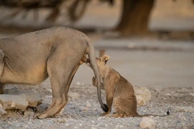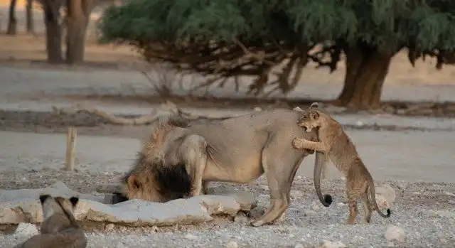 Интересную сцену запечатлела 47-летняя Корлетт Вессельс (Corlette Wessels) на границе Южной Африки и Ботсваны. Лев пил воду, а его детеныш хотел привлечь внимание отца, копошась позади. В кокой-то момент львенок увидел "шарики" под хвостом отца и укусил за один за них. Самцы львов могут быть очень агрессивными и легко, одним взмахом лапы или укусом, убить детеныша. Но этот лев лишь издал недовольный рык, чтобы предупредить львенка, что так делать нельзя, а затем продолжил пить воду, прежде чем вскоре направиться к остальной части прайда.