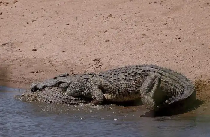На шокирующих кадрах ниже показан момент, когда голодный крокодил весом 540 кг пытается съесть более молодую рептилию, вонзив в её тело свои 10-сантиметровые зубы.