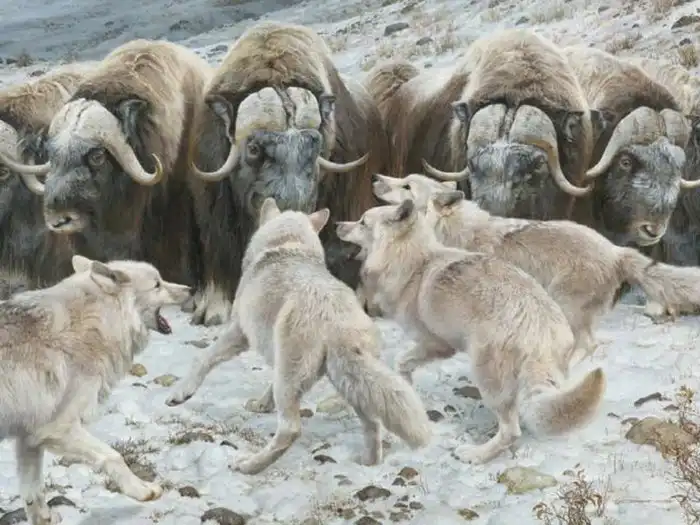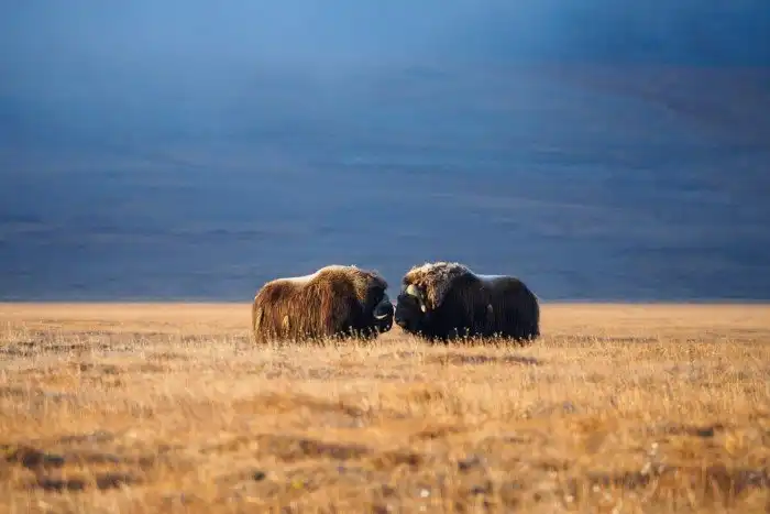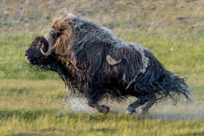 Овцебыки в борьбе за самок разбегаются и врезаются головами. Сила их столкновения равна тонне.