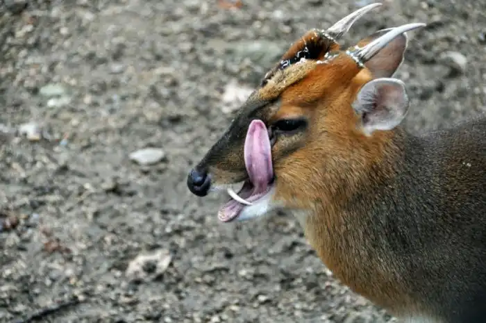 Язык у мунтжаков настолько длинный, что с легкостью достает до глаз. Чистку слезных каналов абы кому не доверишь!