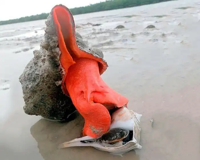 Нежась в водах Мексиканского залива, рыжая бестия освоила прибрежную зону с гладким песочным дном без камней и скал, в хорошо прогретой воде на глубине 5-8 метров. Почему рыжая? Потому что мускулистая ножка у неё ярко-оранжевая. Почему бестия? Потому что своей конечностью флоридская улитка не только передвигается, но и плющит тех, кто рискует пошутить про её конские размеры.
