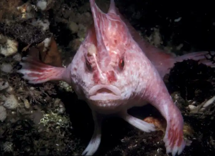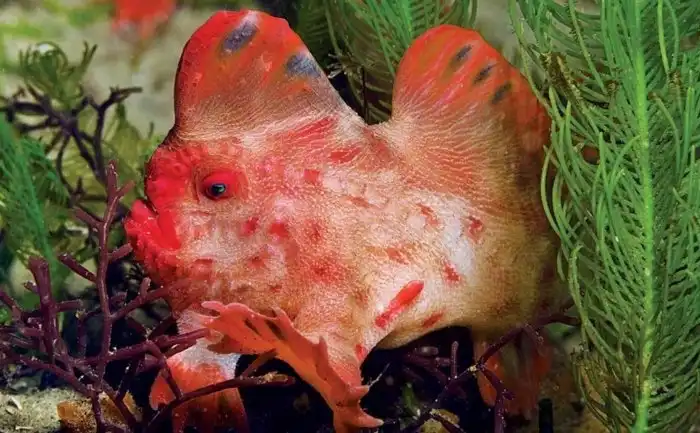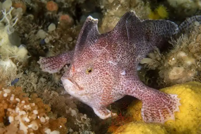 Широко растопырив плавники, рыба натурально ползёт по дну самолично пояснять креационистам за эволюцию. Их конечности настолько стали походить на сухопутные, что за бугром им даже название дали соответствующее — Handfish (рыба-рука). Что тут скажешь: маленький шаг для рыбы-лопаты, но огромный шаг для жабродышащих!
