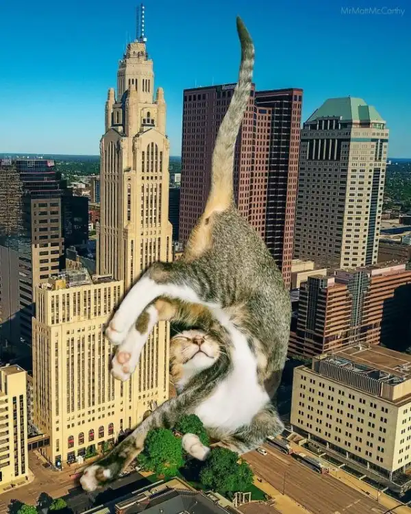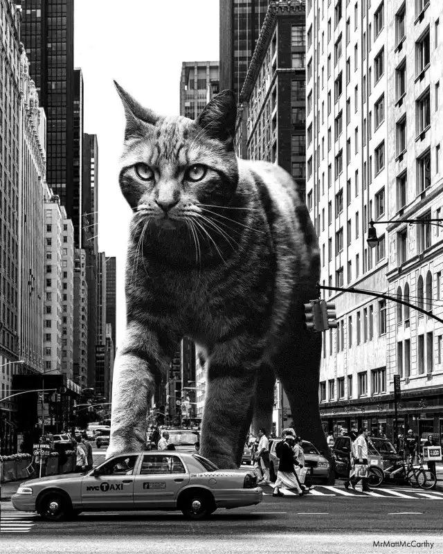 Мэтт Маккарти — художник из Северной Каролины, США, создающий необычные и чертовски забавные коллажи с котиками. Он деформирует их и ловко помещает с помощью магии фотошопа во всевозможные безумные локации, после чего картинки превращаются в настоящие бриллианты сюрреалистического искусства.
