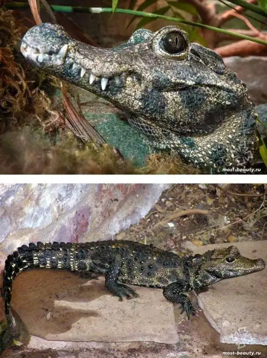 Из-за маленьких размеров его ещё называют карликовый, и это самый маленький крокодил из ныне живущих на нашей планете. Облюбовал для жизни пресноводные водоёмы на западе Африки.