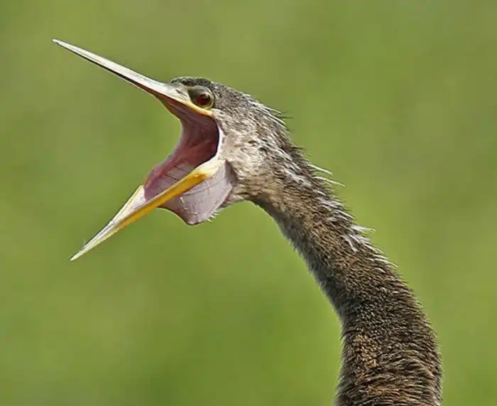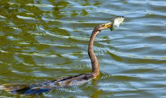 Американская змеешейка: «Сломанная» в 2 местах шея позволяет птице бить настолько мощно, что пробивает рыбу насквозь