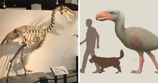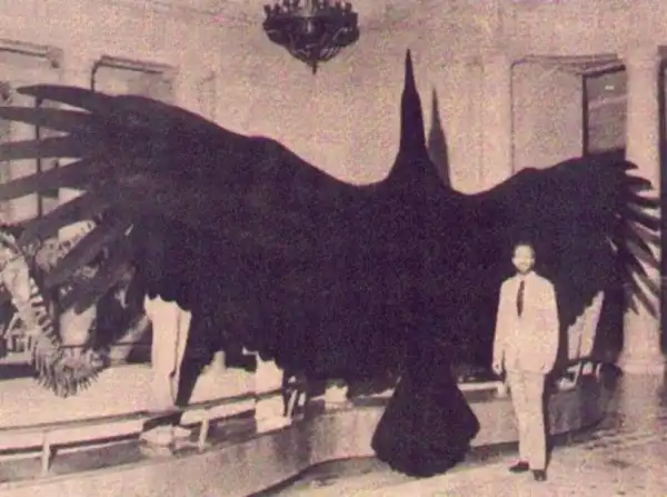 К большому сожалению для современников аргентависа, это была хищная птица. Она же считается самой крупной летающей птицей в истории с размахом крыльев 6,9 метров и скоростью 67 км/ч. На фото исследователь Кеннет Кэмпбелл стоит рядом с моделью аргентависа.
