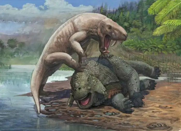 Уже представили, как наш герой вёл безопасную и размеренную жизнь? Так вот, забудьте! Не было никакой безопасности даже тогда! Взрослых парейазавров c легкостью валили саблезубые современники живого танка — горгонопсы и диногоргоны. Увы, прочная броня в гонке вооружений оказалась бессильна против мощных клыков.