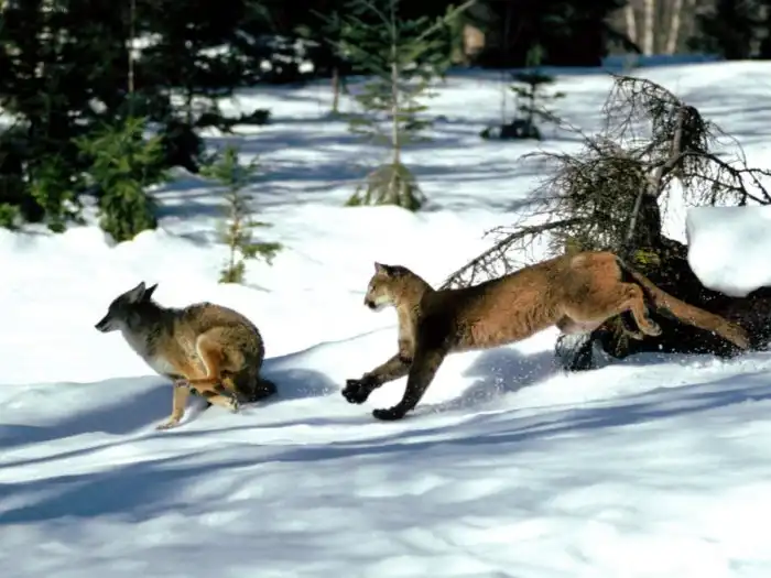 В Северной Америке волки не без причин боятся встреч с пумой. Это крупная кошка, высотой до 80 см в холке и весом более 100 кг. Пума хищник, что называется, без тормозов. Кошка ест всё, что способна схватить, начиная от мелких грызунов и заканчивая оленями, домашними собаками и молодыми медведями. Пума настолько сурова, что иногда не брезгует заниматься каннибализмом...