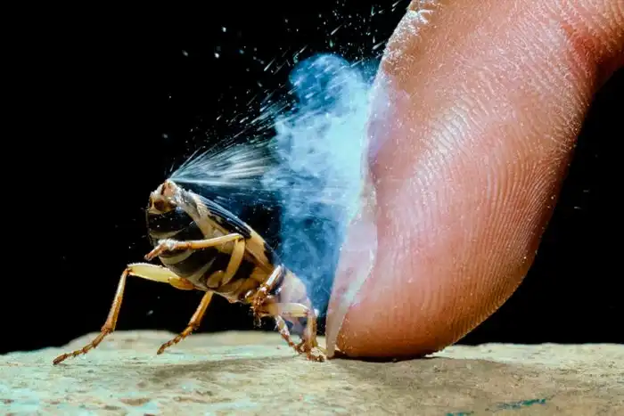 Насекомое вооружено парными железами на конце брюшка, которые выстреливают в противника токсичной, пахучей, раскаленной до 100 °C жидкостью. Скорость выброса достигает 36 км/ч.