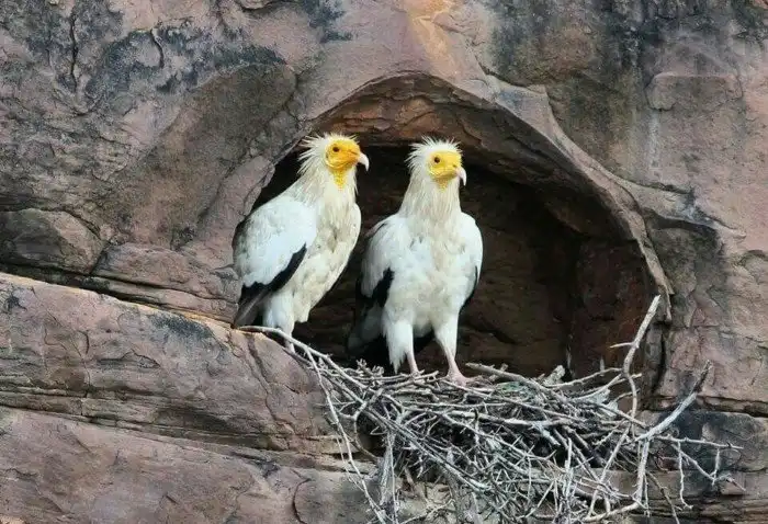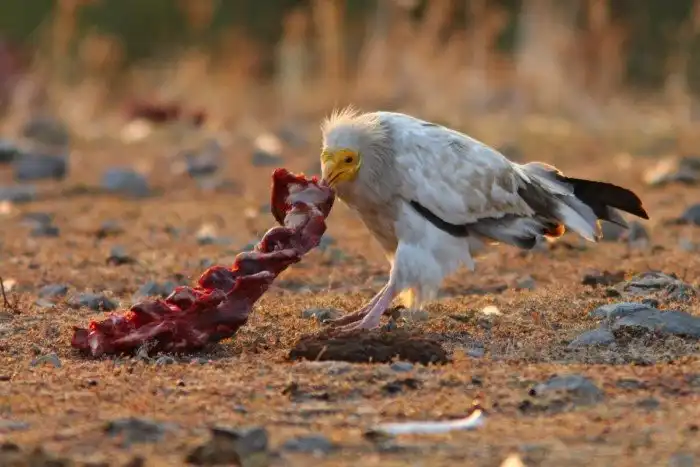В цепи доедания за крупными хищниками наши герои занимают место между грифами и насекомыми. Будучи самыми мелкими из падальщиков, они не способны противостоять многочисленным стаям шакалов и бандам грифов. Всё что есть у стервятников: 2 килограмма веса, размах крыльев в 1,5 метра да крепкий загнутый клюв. Даже удивительно, что с такими физическими данными они смогли заселить территорию от Кавказа до Южной Африки, от Индии до Испании.