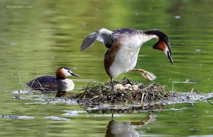 Изящнее справилась лишь малая поганка. Она просто собрала гнездо и отправилась на нём в плавание. Слишком просто? Зато как романтично жить в свободно плавающем доме, не зная, куда тебя понесет течение. Хищники, к слову, тоже не знают. Ни одна лиса не решится плыть на середину реки ради парочки яиц.