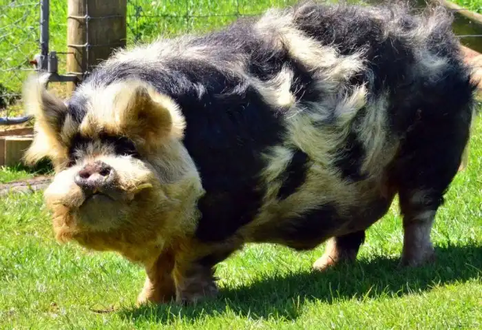 Новозеландцев смело можно называть самыми прямолинейными наименователями, ведь свинки действительно вышли пухлыми. При размере до метра свинки отъедаются до 70-100 кило. Курносая мордаха и короткие ножки прибавляют +100500 к шарообразности. Да и густая пестрая шерсть самых разных оттенков, от черного до рыжего, придает животине объема.
