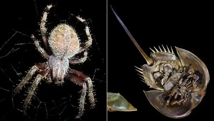Второй необычный дуэт в отличие от первого никогда не пересекается, потому как родственнички живут в разных стихиях — на суше и на море. Итак, это пауки и... мечехвосты! Стоп, разве мечехвовосты — не ракообразные? Нисколечки! Они гораздо ближе к паукам и скорпионам, которые отделились от общего предка 500 млн лет назад.
