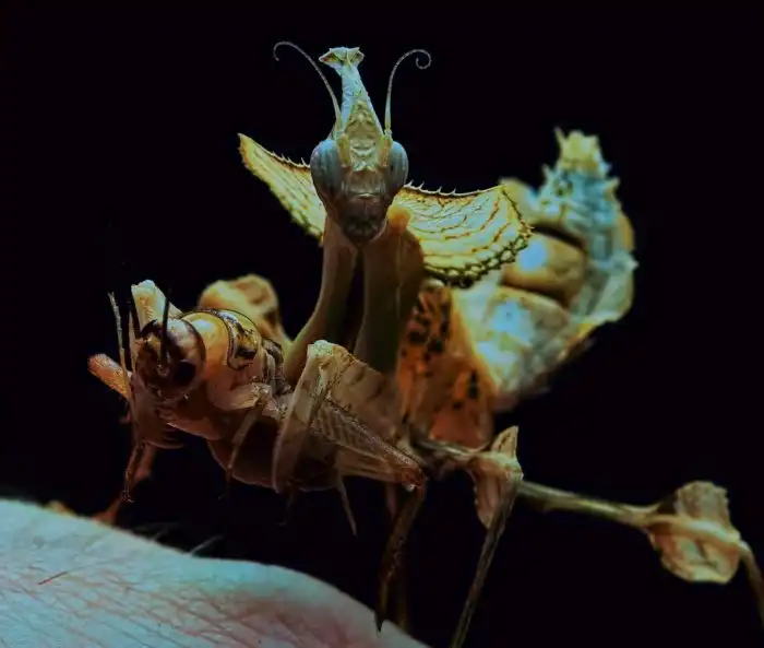 У самок еще дополнительный квест — сделать закладки с яйцевыми капсулами в разных местах. Если все идет по плану, то вскоре из них выйдут от 30 до 80 «цветов жизни». Однако собрать букет и вручить бабушке, как это делают люди, не выйдет. Уже на первой стадии детишки весьма боевые: кто не охотится, тот не ест и не растет. Недаром в богомольем языке нет слова «веган».