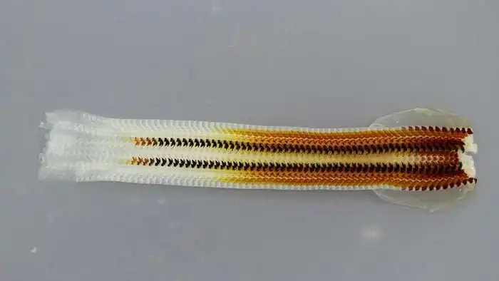А вот что делать с зубами, я ума не приложу, ведь это настоящие произведения искусства. Каждой моллюск снаряжён радулой: тёркой, на которой расположено множество мелких зубов из азовскита — минерала, состоящего из оксидов железа и фосфора. На самом кончике зубцы дополнительно укреплены магнетитом. Именно благодаря такому кусалу животное соскабливает пищу с камней, не испытывая дискомфорта. Возможно, их стоит отдавать металлургам, пусть развлекаются.