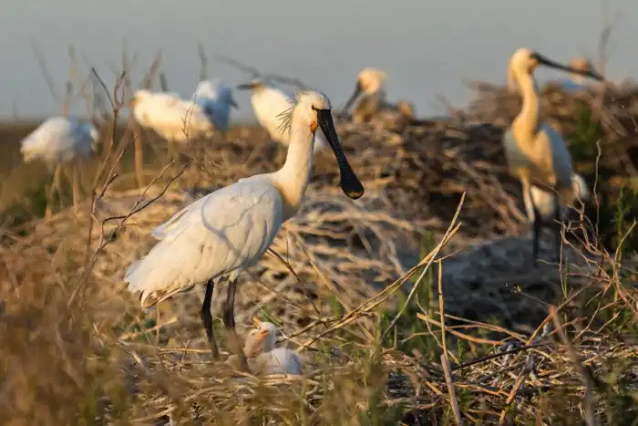 Даже воспитание детей у них не дело закрытой ячейки общества, а задача всего коллектива. Сплетенные из камышей гнезда перемешиваются настолько, что не поймешь, где заканчивается одно и начинается другое. Иногда ситуация доходит до абсурда, и колпицы начинают скреплять свои гнёзда с гнёздами других видов птиц.