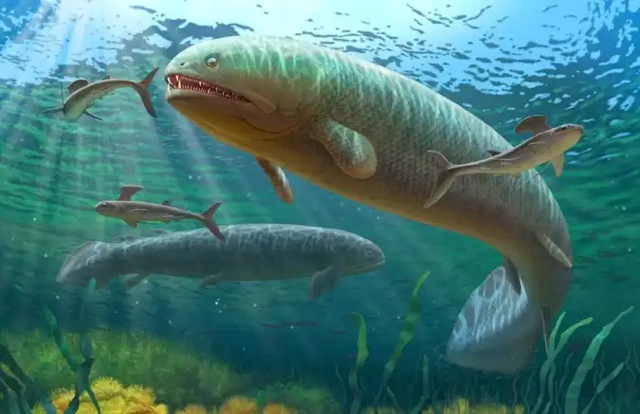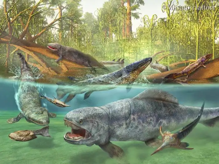 Крупнейшая кистеперая рыба того времени, Ризодус гиберти, вырастала до 5 метров в длину!
