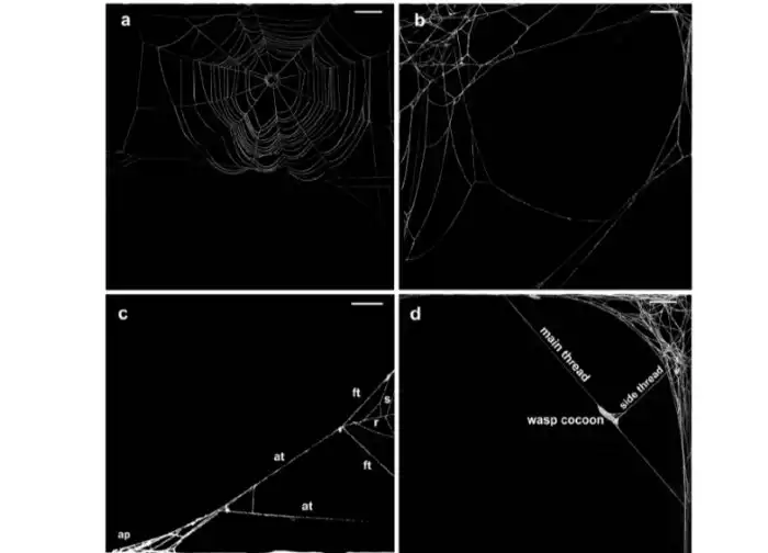 На картинке можно увидеть, как видоизменяется паутина заражённого паука. На последней картинке видно кокон, который Тетрагната соорудила для личинки осы-наездницы.