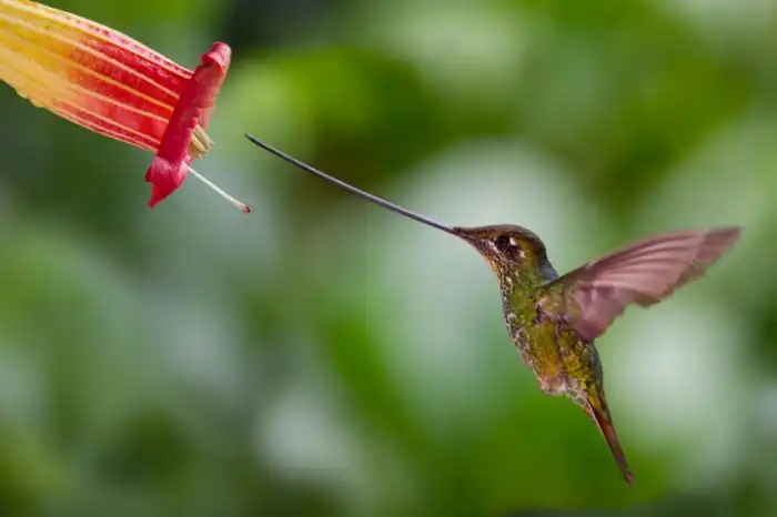 Это — колибри-мечеклюв. Не знаю, сколько он соврал за свою жизнь, но из носа состоит ровно половина от всей длины тела.