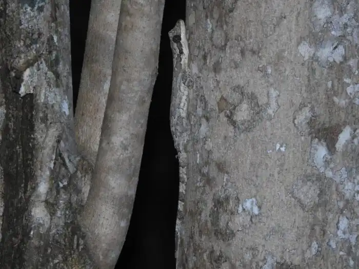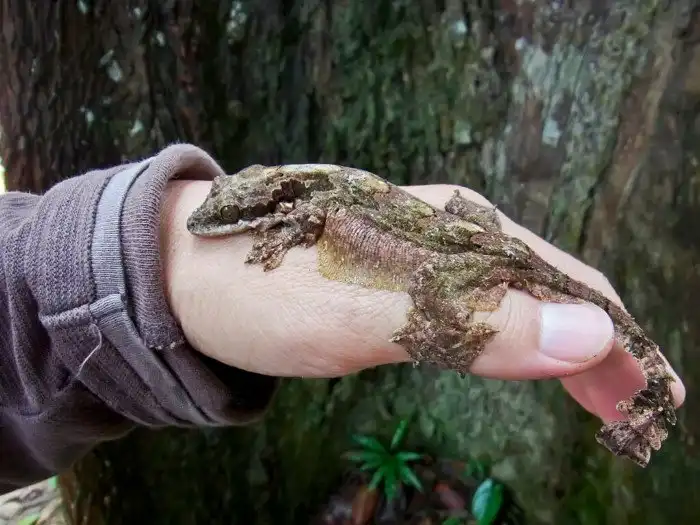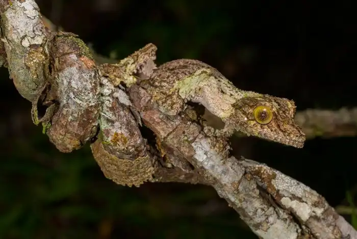 Если не приглядываться, то миниатюрные ящерки длиной не более 20 см больше напоминают кусок коры или обрывок какого-то мусора. На фоне маскировочного костюма выделяются лишь гигантские немигающие глаза. Моргать гекконы не умеют, но убирать пыль из зыркалок как-то надо. В этом им помогает большой длинный язык. Вам слабо облизать свой собственный глаз? А вот им — норм, они каждый день так делают.