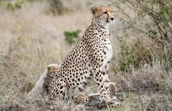 Храбрая самка гепарда прогнала льва, который попытался съесть ее детенышей в Кении