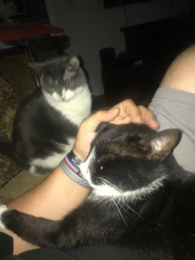 Теперь когда я вожусь с котом, пёс просто ложится поверх него, чтобы перетянуть внимание на себя. Кот просто в шоке от такого расклада.