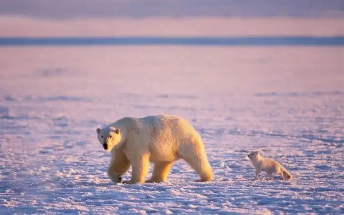 Песцы часто следуют за белыми медведями и подъедают остатки тюленей. Увы, задача это опасная. Если у медведя охота закончится неудачей и он останется голодным – мишка может закусить и песцом.