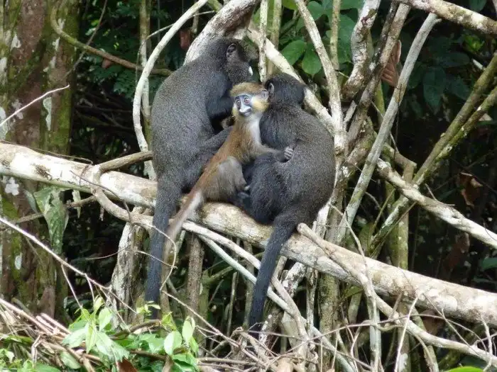 Посередине не ребёнок. Это малая белоносая мартышка. Они часто тусуются вместе с нашими героями и даже способны давать совместное потомство.