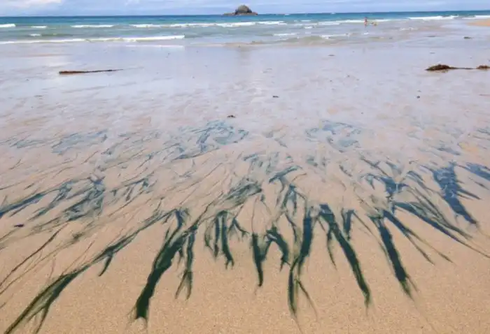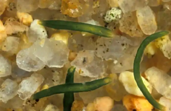 Зелёные образования – это не водоросли, а колонии микроскопических животных, которые называются зелёная коволютида. По следующей фотографии можно судить о размере отделной особи (коволютиды сняты на фоне песчинок):