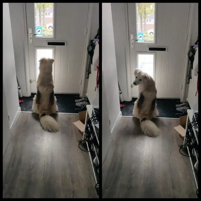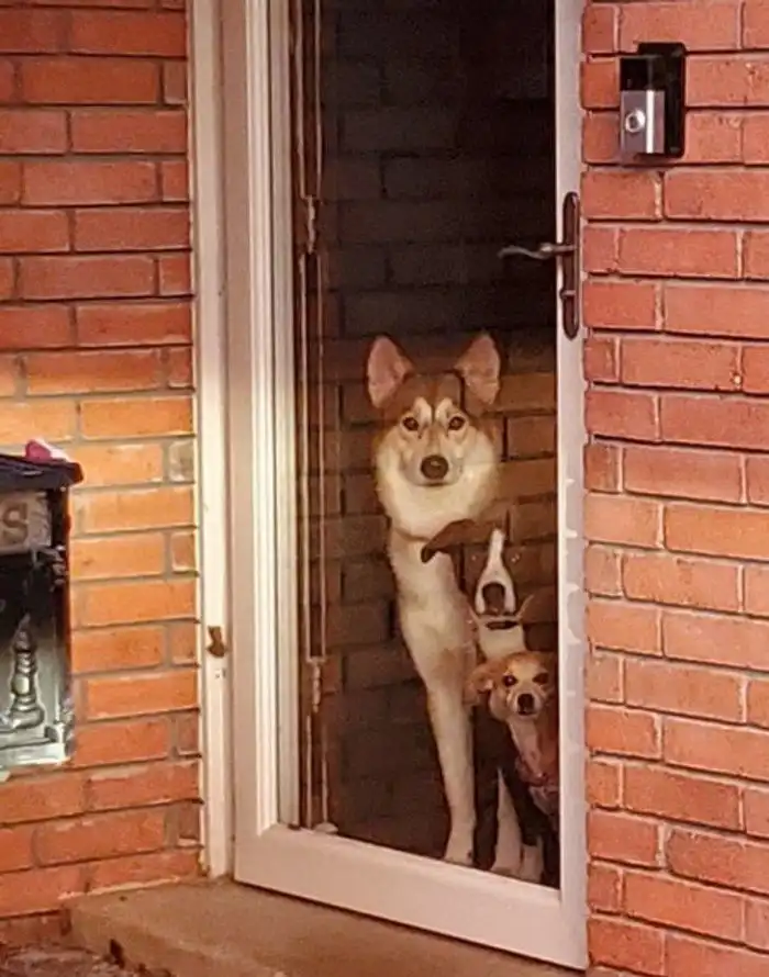 И ведь я даже не попросил!Старший брат помогает сестре пройти через дверцу для собак