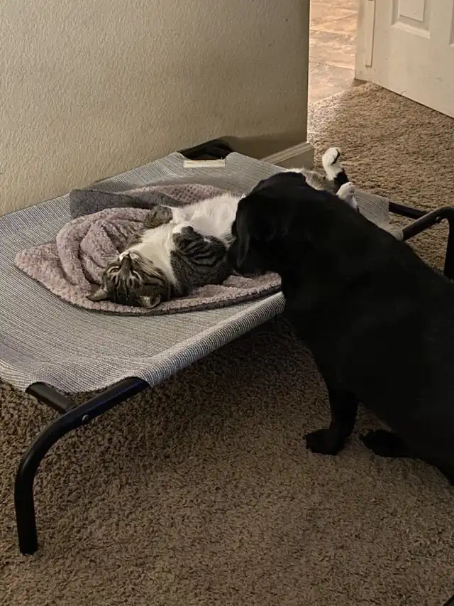 Купили ортопедическую кровать для пожилого пса. Он уступил её 6-месячному котёнку