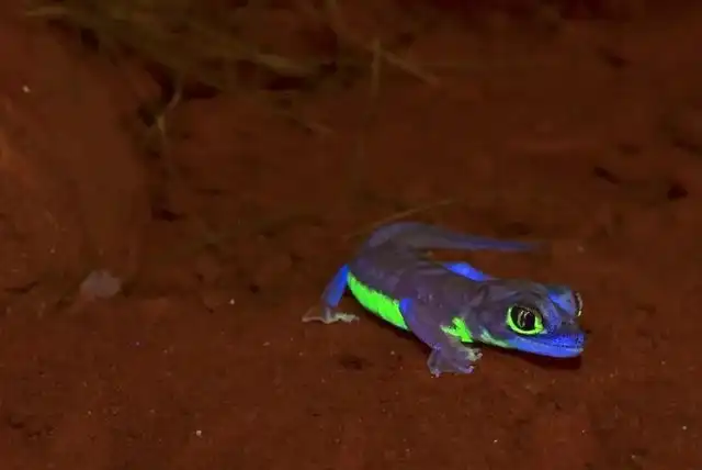Вообще, на территории Намиба обитает сразу несколько видов гекконов, но этот — самый особенный. Дело в том, что наш перепончатолапый друг умеет... светиться! Эту особенность намибийского геккона обнаружили совсем недавно: кто-то ради прикола посветил ультрафиолетовой лампой на своего домашнего геккона, и тот внезапно засиял огнями, будто неоновая вывеска!