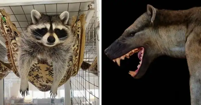 В милом еноте слабо угадываются черты грозного хищника, который держал в страхе лесных обитателей более 25 миллионов лет назад. Гиенодон был небольших размеров, но это не мешало ему вступать в схватку с животными, которые были в разы крупнее. Мощные челюсти зверя легко перекусывали кости и имели способность к самозатачиванию.