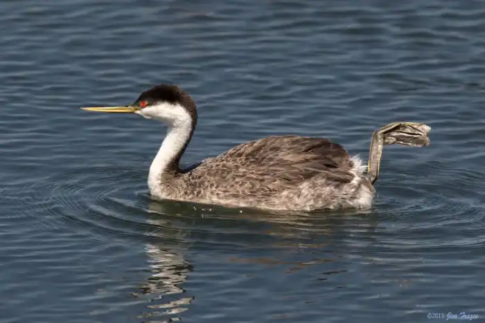 Вообще, западноамериканская поганка — птица не больно красивая. Грузное тело, короткие крылышки, нелепый длинный клюв и жуткие ярко-красные глаза. Такое чувство, как будто её нарисовал ребёнок.