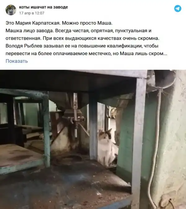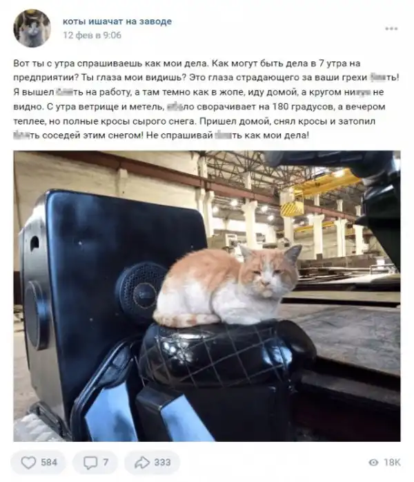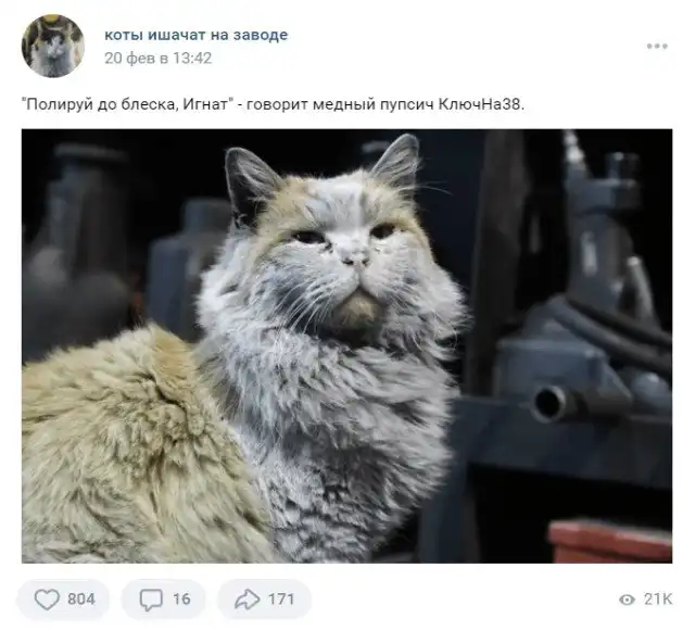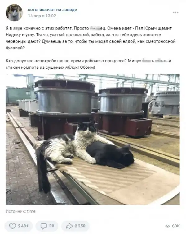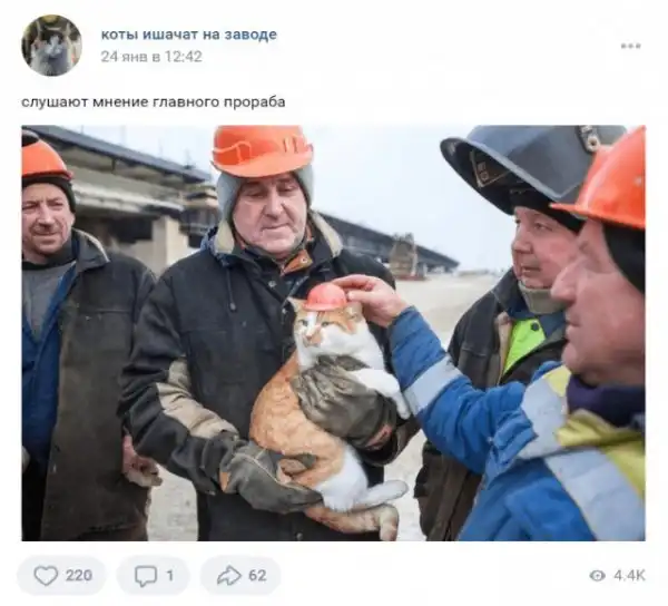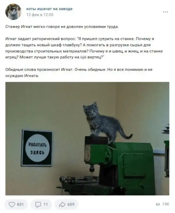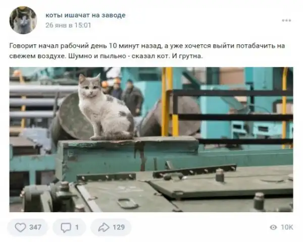 Смешные картинки с животными — один из устоявшихся жанров рунета, до сих пор пользующийся спросом. Многие пользователи иронично отражают своё настроение в мемах с уставшими от повседневности, например, от «работы на заводе» котами. Паблик с именно таким контентом в середине апреля набрал популярность в соцсетях